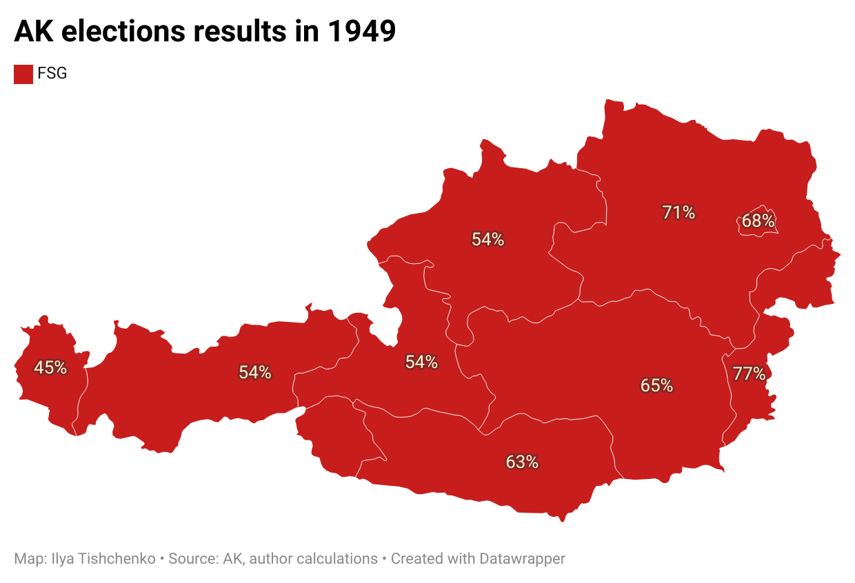 Maps of voting are a bit boring as FSG (SPÖ) always has majority, except in Tirol and Vorarlberg where ÖAAB (ÖVP) take a lead since 1984.